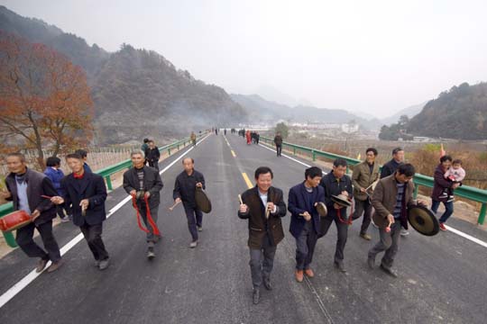 11月10日,大別山旅游扶貧快速通道水毀修復工程漁潭段改線建成通車。當地村民敲鑼打鼓、載歌載舞,以自己特有的方式歡慶這一時刻的到來.